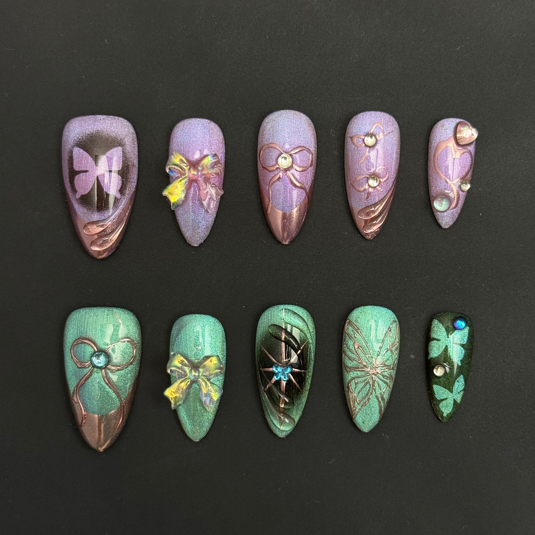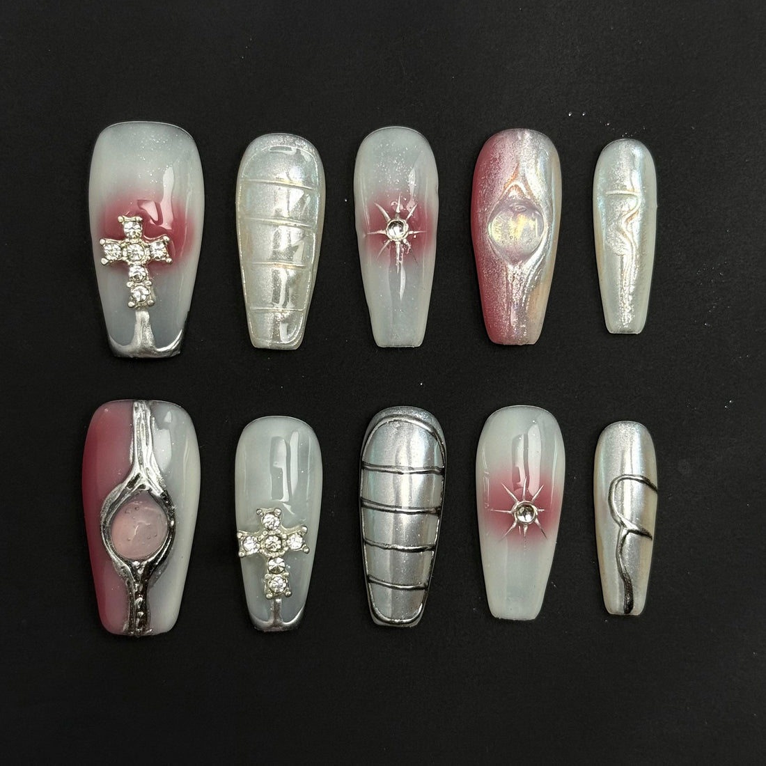 Channel retro-futuristic vibes with our Y2K press-on nails, featuring metallic accents, vibrant hues, and playful designs that scream early 2000s nostalgia!